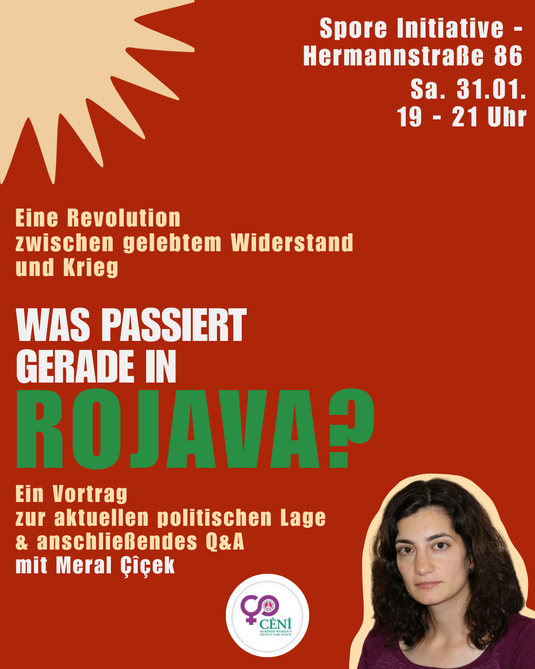 Januar 27, 2026wir Cênî, das kurdischen Frauenbüro für Frieden in Berlin möchten Sie dringlichst zu unserer Informationsveranstaltung zu Rojava einladen. Die Veranstaltung richtet sich an alle Interessierten, die sich mit der akuten, bedrohlichen politischen Lage in der Autonomen Administration von Nord- und Ostsyrien (Rojava) auseinandersetzen möchten und einen differenzierten Einblick in die gegenwärtigen Entwicklungen suchen. Im Zentrum des Abends steht ein Vortrag der kurdischen Aktivistin Meral Çîçek, die einen Überblick über die aktuelle Situation in Rojava gibt. Der Fokus liegt dabei auf den politischen Herausforderungen, mit denen die Region derzeit konfrontiert ist. Der Vortrag ordnet die jüngsten Ereignisse historisch und politisch ein…